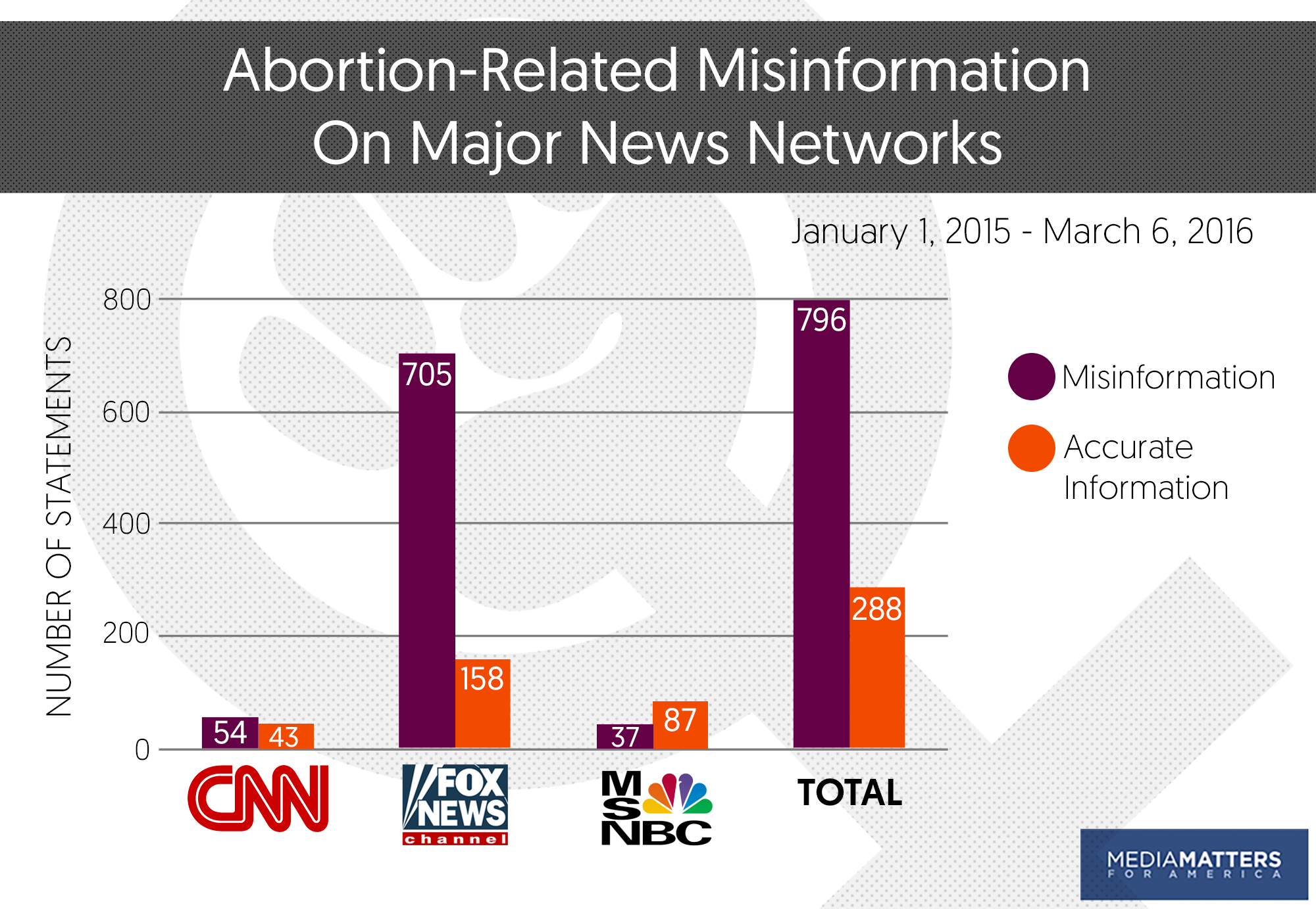 In this chart, Media Matters highlights the findings of a study showing how evening and primetime news programs airing on cable news conveyed more inaccurate than accurate statements about abortion. The researchers found that Fox News aired 705 inaccurate statements about four abortion-related topics and 158 accurate ones, while CNN aired 54 inaccurate statements and 43 accurate statements. In contrast, on MSNBC, 87 statements were accurate while 37 were not.