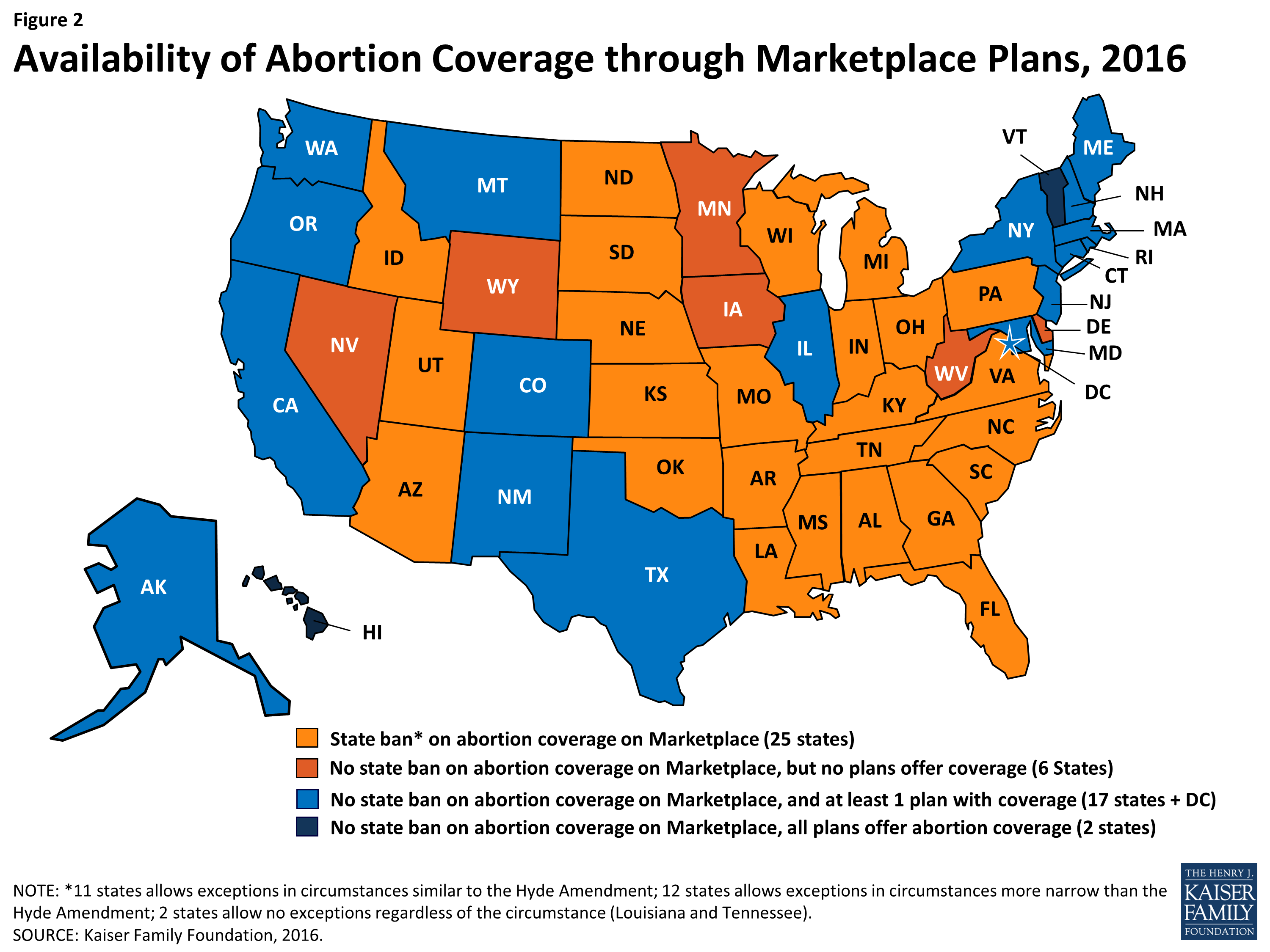 In this map, the Kaiser Family Foundation shows how widely abortion coverage varies from state to state in insurance plans sold through the Affordable Care Act's (PL 111-148) insurance marketplaces.
