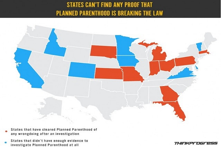 In this map, Center for American Progress' "ThinkProgress" spotlights the 12 states that have cleared Planned Parenthood of any wrongdoing after launching investigations into the organization following the release of misleading videos targeting Planned Parenthood's fetal tissue donation program.