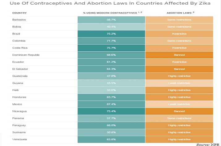 This chart, compiled by NPR, shows how the majority of countries affected by the Zika virus, which might be linked to a severe birth defect, curb access to contraception and abortion care.