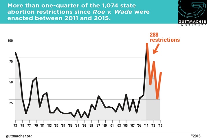 The Guttmacher Institute in this graph shows the rapid increase in the number of state abortion restrictions over the past few years.